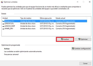 Si deseas desfragmentar el disco, haz clic en Optimizar. Cuando el proceso termine, el porcentaje de archivos fragmentados debe ser cero.