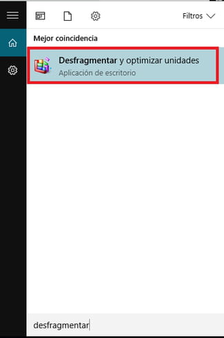 Escribe desfragmentar en la barra de búsqueda y cuando aparezca la herramienta Desfragmentar y optimizar unidades, selecciónala: