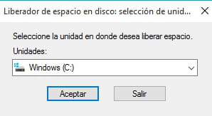 Lo primero que te aparecerá es una ventana en la que tienes que elegir el disco duro que quieres limpiar para liberar espacio. Cuando lo elijas pulsa en Aceptar.